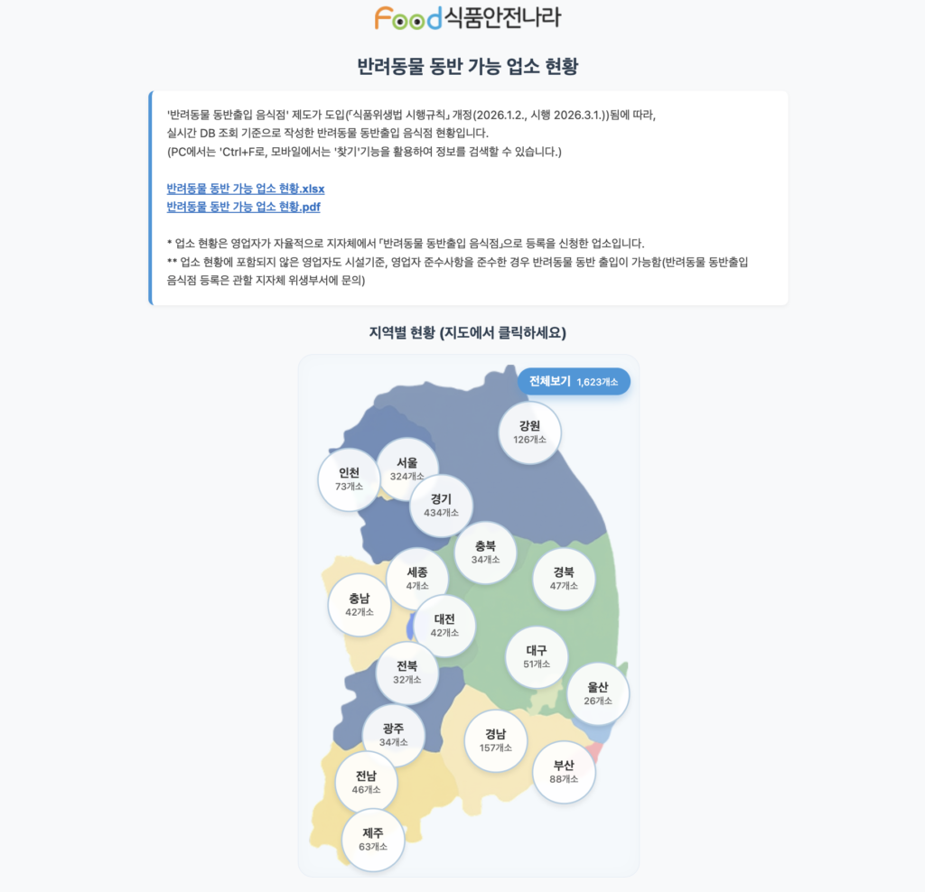 반려동물과 함께 외출하실 때 가장 중요한 것은 공식적으로 동반 출입이 가능한 업소인지 여부를 확인하는 일입니다. 2026년 3월부터 「식품위생법 시행규칙」 개정에 따라 반려동물 동반출입 음식점 제도가 본격 시행되었습니다. 현재 식품안전나라에서는 지자체에 자율 등록된 업소를 기준으로 전국 애견동반 가능 음식점 현황을 실시간으로 제공하고 있습니다. 지역별·업소별 검색이 가능하며, 엑셀과 PDF 파일로도 내려받을 수 있어 활용도가 높습니다. 업소 현황에 포함되지 않은 영업자도 시설기준, 영업자 준수사항을 준수한 경우 반려동물 동반 출입이 가능합니다.
