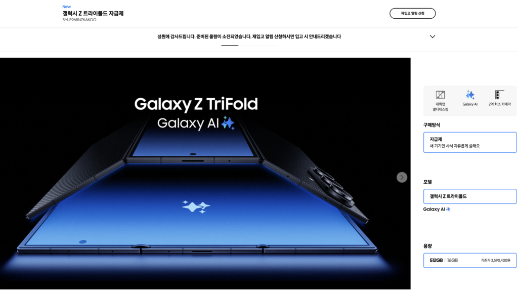 갤럭시 Z 트라이폴드는 삼성의 최신 3단 폴더블 스마트폰으로, 253mm 초대화면·듀얼 힌지·2억 화소 카메라·Galaxy AI 기능까지 모두 갖춘 혁신 모델입니다. 가격, 스펙, 색상, 실구매 혜택을 한 번에 확인할 수 있는 갤럭시 Z 트라이폴드 구매 바로가기 링크를 알려드리겠습니다. 준비된 물량이 소진된 경우 재입고 알림 신청하시면 입고 시 안내를 받을 수 있습니다.