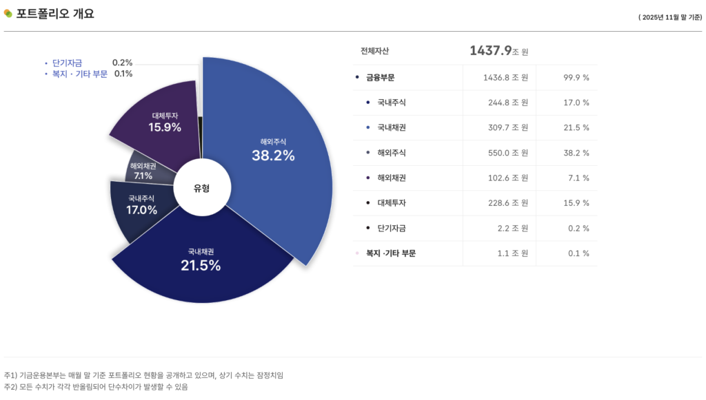 국민연금은 기금운용본부를 통해 국내와 해외로 자산을 분산 투자하고 있으며, 투자 비중은 매년 공식 공시를 통해 확인하실 수 있습니다. 운용현황에 따르면 국민연금은 국내 주식·채권뿐 아니라 해외 주식과 해외 채권 비중을 점진적으로 확대하며 장기 수익성과 안정성을 동시에 추구하고 있습니다. 국내·해외 투자 비중과 자산군별 구성은 국민연금기금운용본부 공식 홈페이지에서 가장 정확하게 확인하실 수 있습니다.