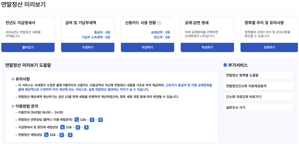 국세청 연말정산 미리보기 서비스가 개통되어 올해 1~9월 카드 사용액과 지난해 공제 내역을 기반으로 예상 세액을 미리 계산해볼 수 있습니다. 이를 통해 연말 소비·저축 계획을 미리 조정할 수 있고, 익숙하지 않은 공제·감면 항목도 유의사항과 절세 팁으로 확인할 수 있어 실수 없이 준비할 수 있습니다. 근로자를 위한 맞춤형 안내까지 제공되는 만큼, 연말정산 미리보기 바로가기에서 절세 전략을 200% 활용해보세요.