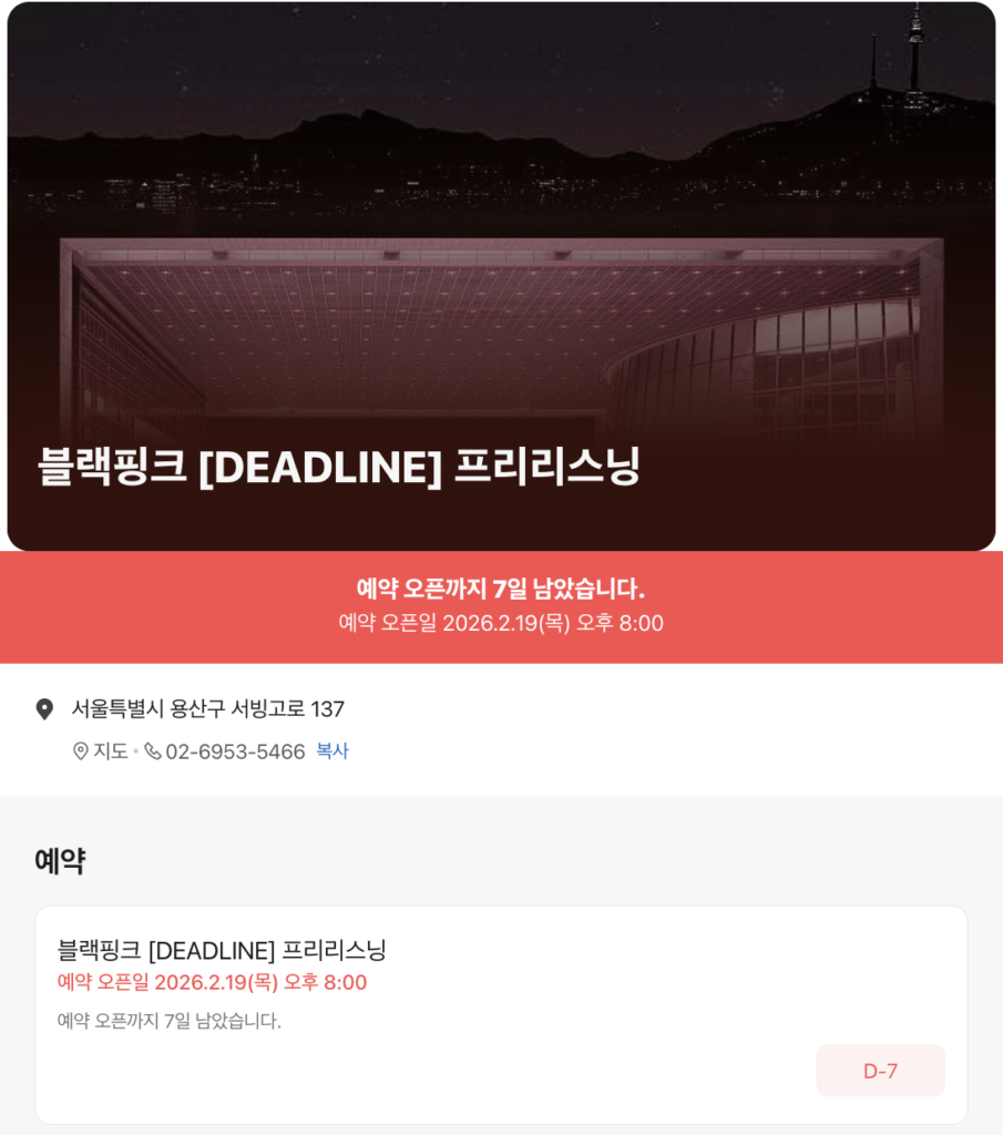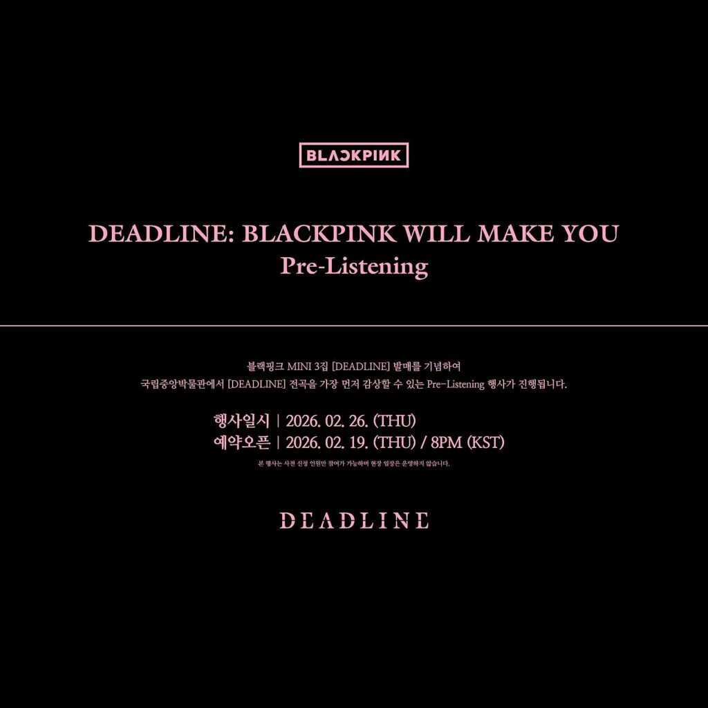 BLACKPINK 3rd MINI ALBUM [DEADLINE] 발매를 기념하여 국립중앙박물관에서 [DEADLINE] 앨범 전곡을 가장 먼저 감상할 수 있는 사전 청음(Pre-Listening)은 2월 26일 단 하루 운영되며, 네이버 예약을 통해서만 참여 가능합니다. 박물관 공간에서 블랙핑크 음악을 경험하는 공식 프로그램으로, 예약 일정과 운영 시간을 반드시 확인하시는 것이 중요합니다.
