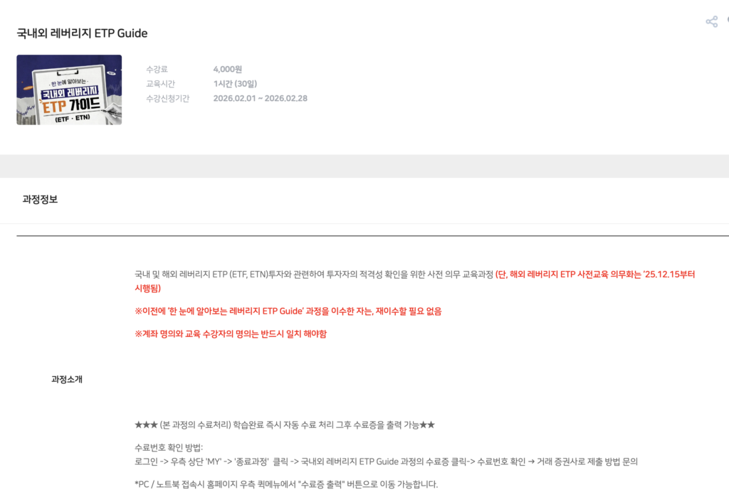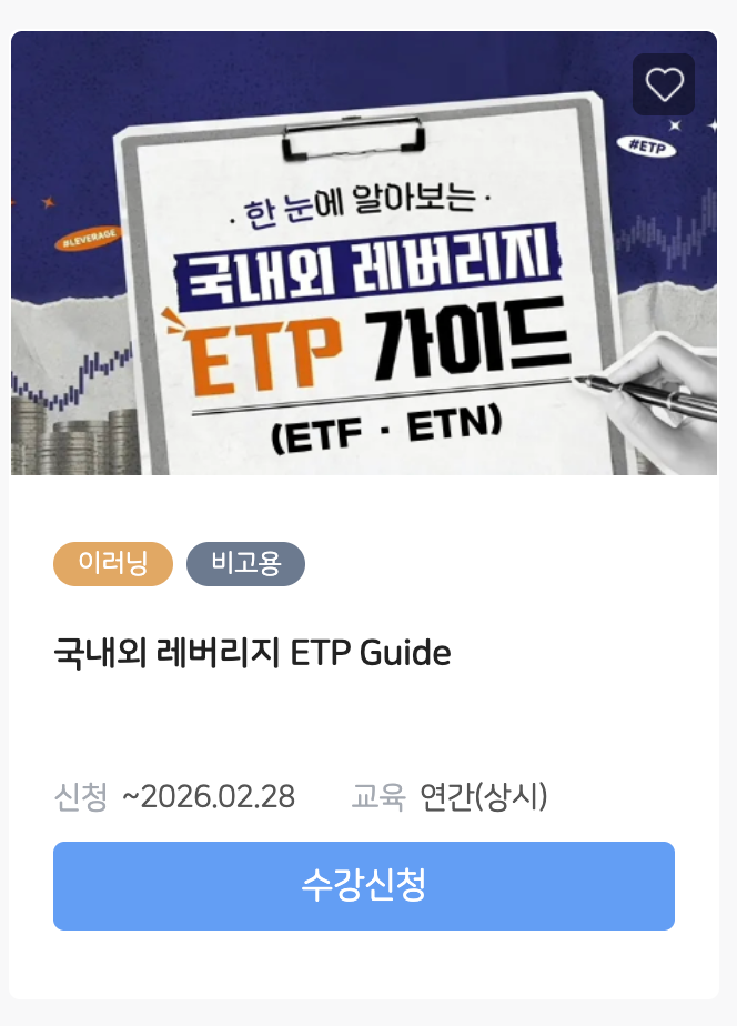 국내외 레버리지 ETP(ETF·ETN)는 고위험 파생상품으로 분류되어 개인투자자는 사전교육 이수가 필수입니다. 금융투자교육원 국내외 레버리지 ETP 가이드는 투자 구조와 위험요소를 체계적으로 안내하는 공식 교육 과정입니다. 수강 후 증권사 앱에서 거래신청이 가능하므로 투자 전 반드시 확인하셔야 합니다.