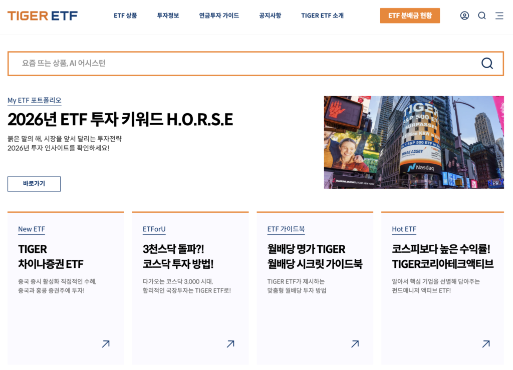 국내 ETF 시장을 선도하는 미래에셋자산운용 TIGER ETF는 주식형, 채권형, 테마형, 월배당 ETF까지 폭넓은 상품 라인업을 제공합니다. 공식 홈페이지에서는 ETF 종류별 구성종목, 총보수(수수료), 분배금 지급 내역, 실시간 지수 정보까지 한눈에 확인하실 수 있습니다. 투자 전 반드시 확인해야 할 공식 기준 정보를 빠르게 확인하실 수 있습니다.