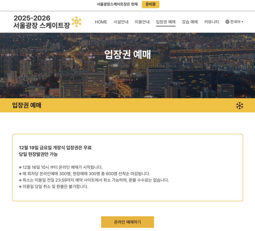서울 도심 한복판에서 겨울을 즐길 수 있는 2025~2026 서울광장 스케이트장이 개장을 앞두고 입장권 예매를 시작합니다. 12월 19일 개장식 당일 입장권은 무료이며 현장 발권만 가능합니다. 입장료는 1,000원으로 동일하며, 이용일 전날 23:59까지는 무료 취소가 가능합니다.