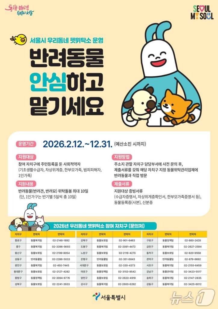 서울시는 명절·입원 등으로 장기간 외출이 필요한 사회적 약자를 위해 반려동물 무료 돌봄 제도인 ‘우리동네 펫위탁소’를 운영하고 있습니다. 2026년 기준 총 24개 자치구가 참여하며 최대 10일까지 무료 이용이 가능합니다. 이용을 원하시는 분은 거주 자치구 동물보호 담당 부서에 문의 후 사회적 약자 증빙서류와 동물등록증을 지참해 지정 위탁소를 방문하시면 됩니다.