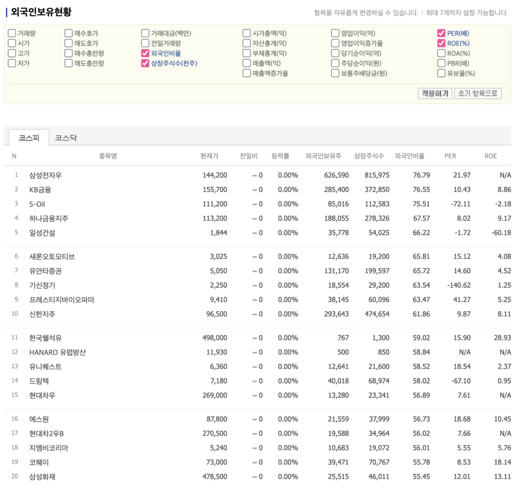 국내증시에서 외국인 투자자의 자금 흐름은 지수 방향성과 종목 추세를 결정짓는 핵심 지표입니다. 특히 외국인보유현황은 단기 매매가 아닌 중·장기 관점의 수급 변화를 보여주기 때문에 신뢰도가 높습니다. 네이버 증권 외국인보유현황 페이지에서는 코스피·코스닥 전 종목의 외국인 보유주식 수, 보유 비율, PER, ROE 등 주요 재무지표를 실시간으로 확인하실 수 있어 ETF 투자, 대형주 분석, 시장 방향성 판단에 매우 유용합니다. 외국인 비중이 꾸준히 증가하는 종목은 상대적으로 안정적인 흐름을 보이는 경우가 많아 투자 판단의 정확도를 높이는 데 도움이 됩니다.