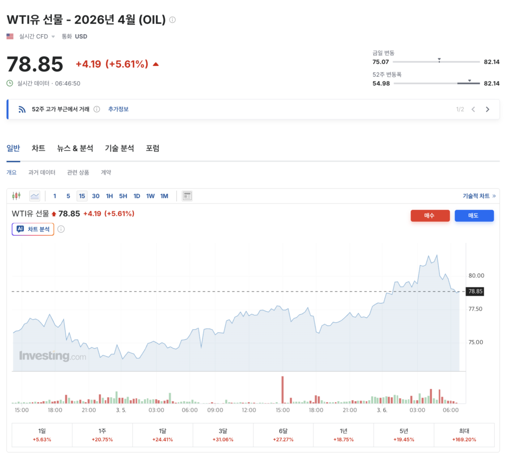 최근 미국과 이란 간 군사적 긴장으로 국제유가 변동성이 크게 확대되고 있습니다. WTI 원유는 미국 원유 시장의 기준 가격으로, 글로벌 금융시장과 물가 흐름에 직접적인 영향을 미칩니다. 동시에 유럽 기준유인 브렌트유와 중동 기준유인 두바이유를 함께 확인하시면 국제유가의 방향성과 지역별 원유 수급 흐름을 보다 입체적으로 파악하실 수 있습니다.