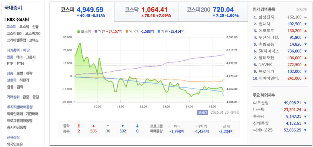 주식 투자를 하실 때 가장 먼저 확인해야 할 지표는 오늘의 코스피·코스닥 지수입니다. 지수 흐름만 파악해도 현재 증시 분위기와 투자 심리를 빠르게 읽을 수 있습니다. 특히 장 시작 전과 장 마감 후 지수 확인은 매매 전략 수립에 매우 중요합니다. 실시간 코스피·코스닥 지수는 네이버 금융과 한국거래소(KRX)에서 가장 정확하게 확인하실 수 있습니다. 지수와 함께 등락률, 거래대금까지 함께 살펴보시는 것이 좋습니다.