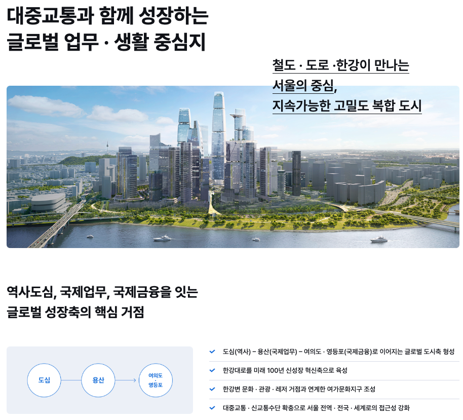 용산국제업무지구는 서울의 미래 글로벌 비즈니스 중심지로 조성되는 대규모 도시개발 프로젝트입니다. 용산 서울 코어 공식 웹사이트에서는 사업개요, 개발컨셉, 마스터플랜, 교통계획, 정주환경, 분양정보까지 한눈에 확인하실 수 있습니다. 국제업무존·업무복합존·업무지원존으로 구성된 입체 융복합 도시 구조와 스마트시티, 친환경 녹지 계획 등 핵심 정보가 체계적으로 안내되어 있어 신뢰도가 높습니다. 공공 주도로 추진되는 안정적인 도시개발 사업의 최신 소식과 공식 자료가 필요하신 분들께 필수적인 사이트입니다.