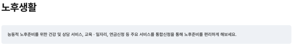 노후를 준비하는 분들을 위해 정부24에서는 노후생활 원스톱 서비스를 제공하고 있습니다. 해당 서비스는 건강관리, 노인일자리, 노후준비 교육, 상담 서비스, 각종 요금 감면, 국민연금 및 기초연금 신청까지 한 번에 통합 신청할 수 있는 정부 공식 서비스입니다. 여러 기관을 따로 방문할 필요 없이 온라인에서 간편하게 이용할 수 있어 접근성과 편의성이 높습니다. 노후생활에 필요한 핵심 행정·복지 서비스를 빠르게 확인하고 싶으신 분들께 꼭 필요한 제도입니다.
