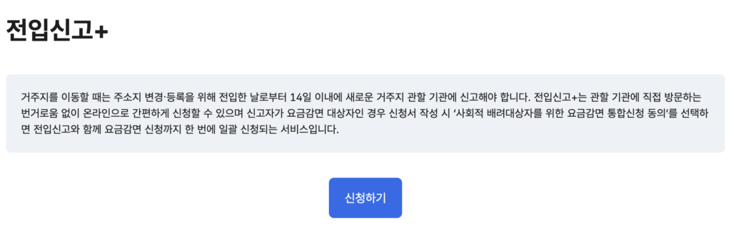 이사 후 반드시 해야 하는 행정 절차가 바로 전입신고로 거주지를 옮긴 날로부터 14일 이내에 신고해야 하며, 현재는 주민센터 방문 없이 정부24 원스톱 서비스를 통해 온라인으로 간편하게 신청할 수 있습니다. 공동·간편인증 로그인만으로 24시간 신청 가능하며, 기초생활수급자·차상위계층·장애인·다자녀 가구 등은 요금 감면 신청까지 한 번에 처리할 수 있습니다. 이사 후 빠르고 정확한 주소 변경이 필요하시다면 정부24 전입신고 서비스를 이용해 보시기 바랍니다.