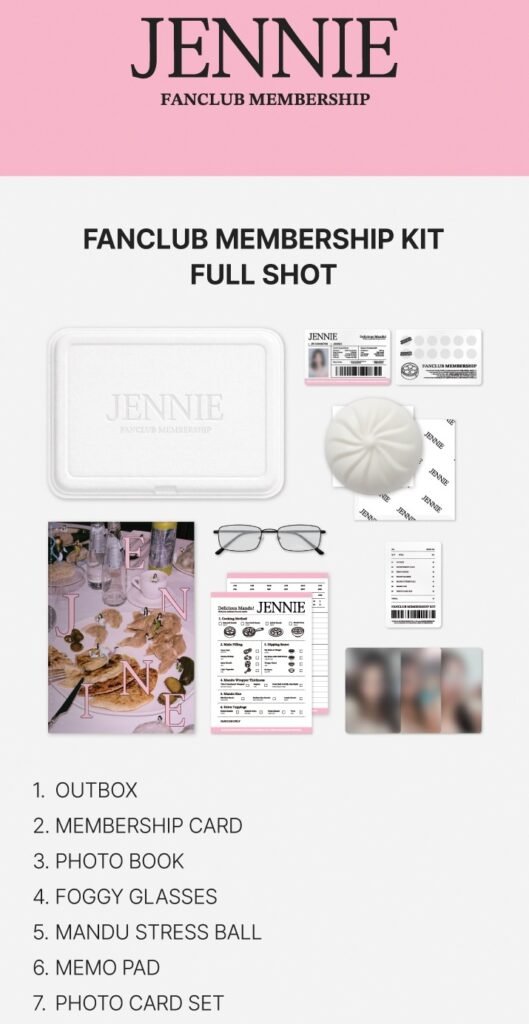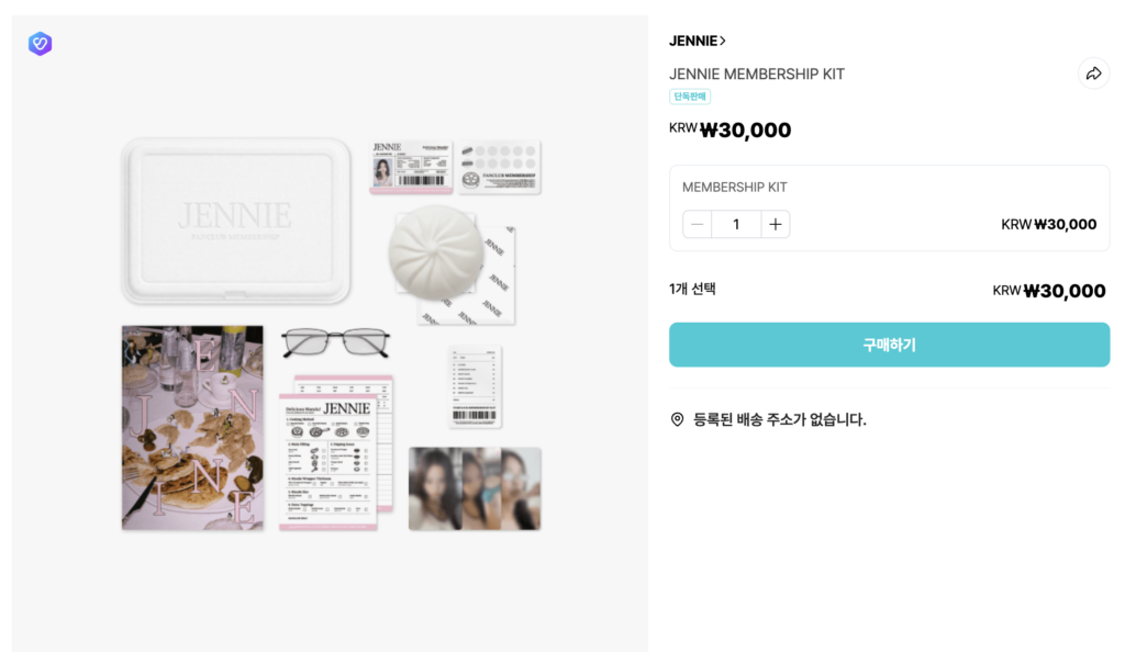 JENNIE 팬클럽 공식 굿즈인 JENNIE MEMBERSHIP KIT는 Weverse Shop에서 멤버십 가입자에 한해 구매 가능합니다. 가격은 30,000원이며, 멤버십 카드·포토북·포토카드 등으로 구성됩니다. 키트는 결제월 기준 4~5개월 내 순차 배송되며, 1인 1개 한정 판매입니다.