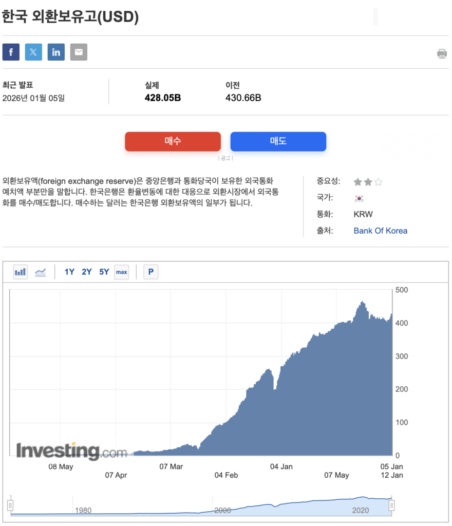 한국 외환보유고는 국가의 외환 안정성과 금융 신뢰도를 판단하는 핵심 지표입니다. 외환보유고는 한국은행이 관리하며, 매월 공식 통계를 통해 달러(USD) 기준으로 공개됩니다. 외환시장 동향, 환율 변동, 국가 신용도 분석에 관심 있는 분이라면 정기적인 확인이 필요합니다. 공식 통계 기반으로 최신 수치를 확인하시면 보다 정확한 경제 흐름을 파악하실 수 있습니다.