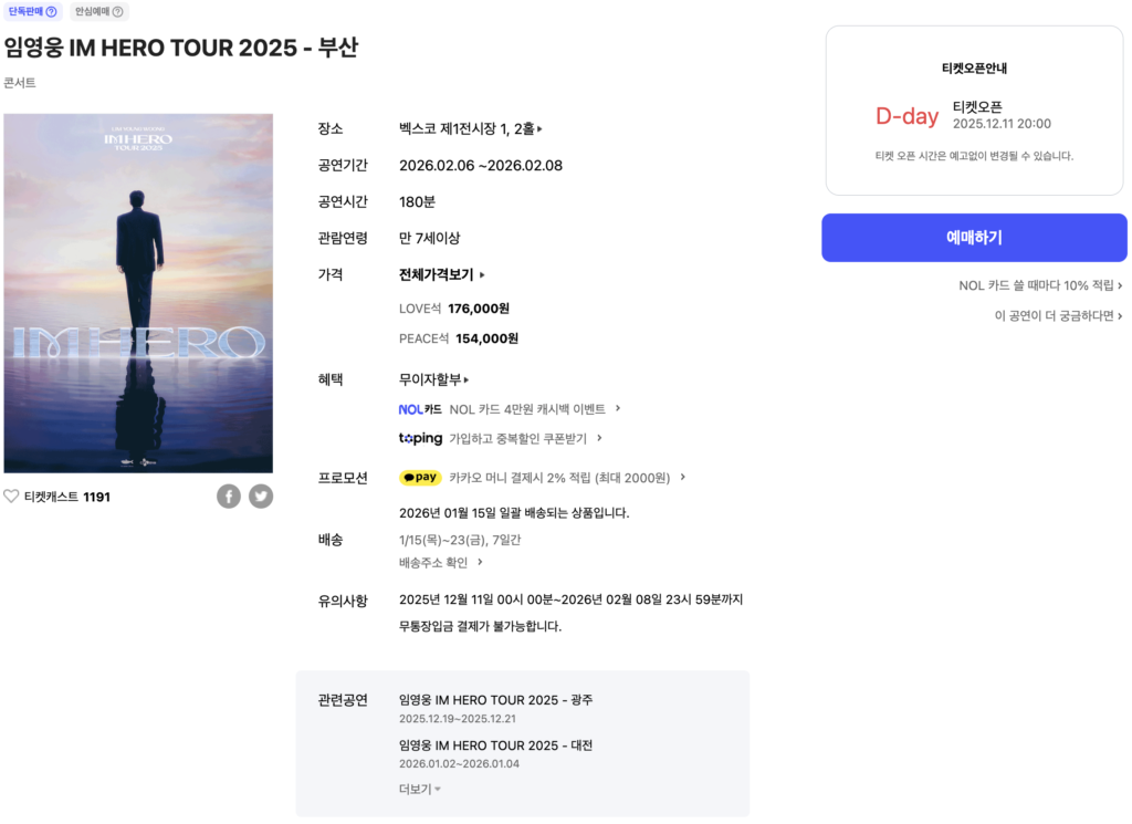 2025 임영웅 전국 투어 콘서트 IM HERO 부산 공연 티켓 예매가 12월 11일(목) 오후 8시에 오픈됩니다. 예매는 NOL 인터파크에서 가능하며 공연은 2026년 2월 6~8일 벡스코 제1전시장 1·2홀에서 진행됩니다. 아래에서 바로가기 링크로 빠르게 확인해보시기 바랍니다.