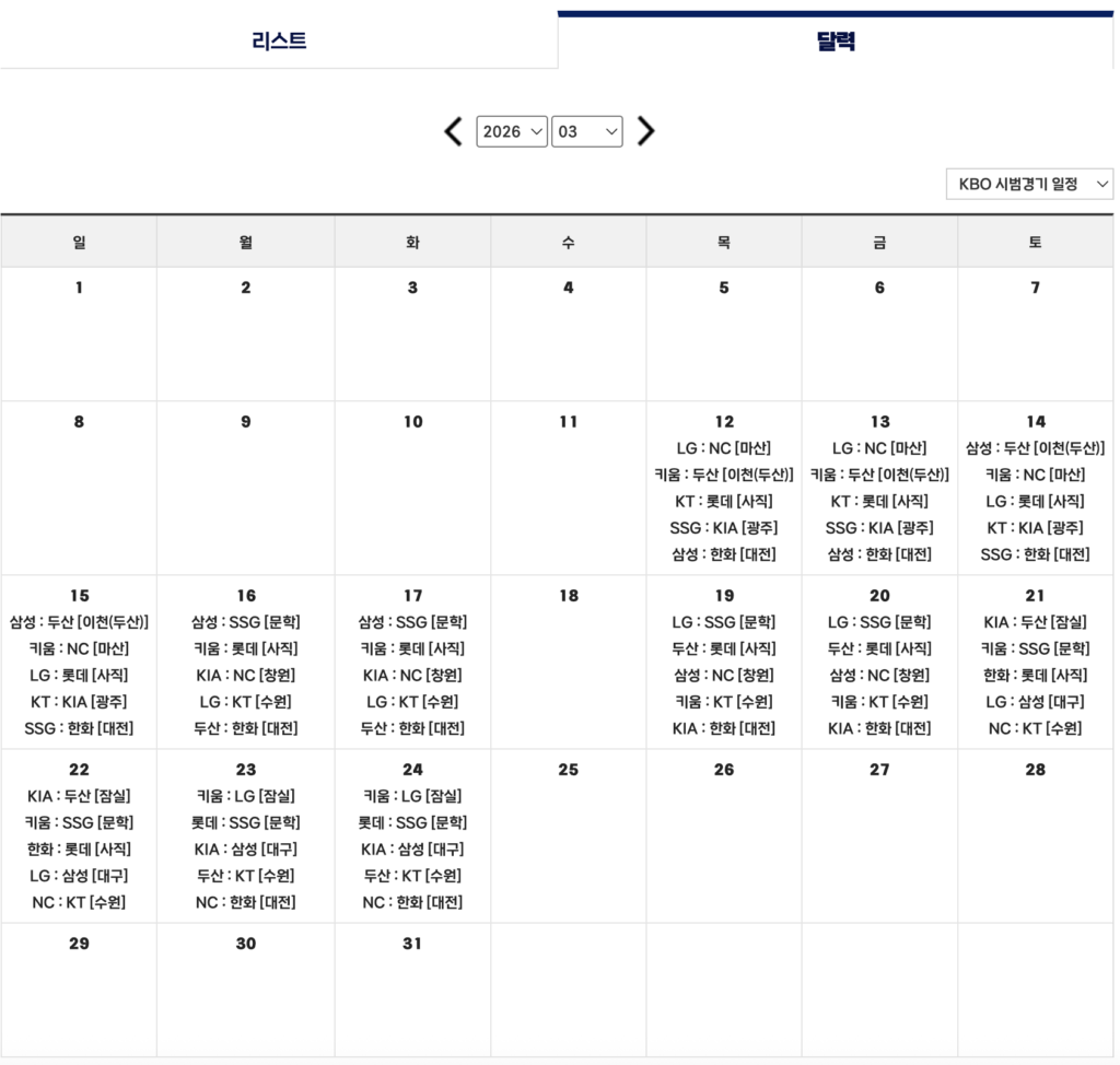 • 2026년 KBO 시범경기 일정: 2026년 3월 12일(목)~ 3월 24일(화) 오후 1시