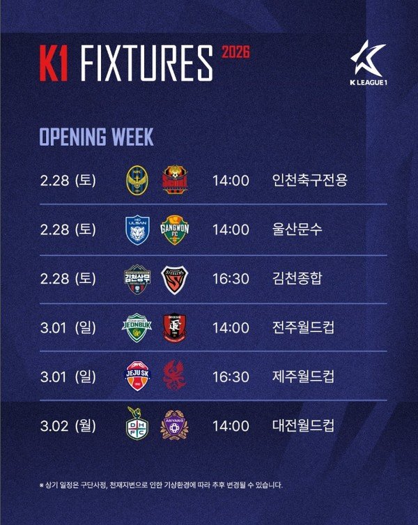 2026시즌 K리그1 정규 일정이 한국프로축구연맹을 통해 공식 발표되었습니다. 이번 시즌은 총 12개 구단이 참가하며, 정규리그는 1라운드부터 33라운드까지 진행됩니다. 개막전은 2월 28일, 인천 유나이티드와 FC서울의 맞대결로 시작되어 큰 관심을 모으고 있습니다. 각 팀의 홈·어웨이 일정까지 함께 공개되어 팬들의 경기 관람 계획 수립에도 도움이 될 전망입니다.