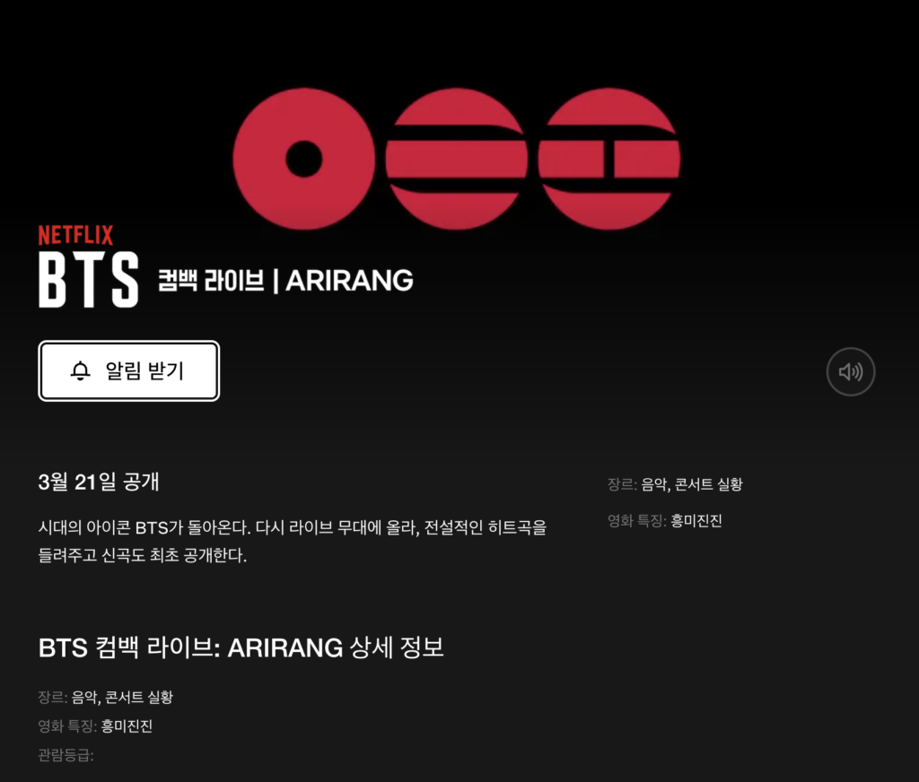 방탄소년단(BTS)의 ‘컴백 라이브 공연:아리랑’이 넷플릭스를 통해 전 세계 190개국에 단독 생중계됩니다. 넷플릭스가 특정 가수의 단독 콘서트를 실시간으로 중계하는 것은 이번이 처음으로, 글로벌 음악 콘텐츠 역사에서도 상징적인 사례로 평가받고 있습니다. 공연은 하이브와 넷플릭스가 공동 연출하며, 공연 이후에는 정규 5집 ‘아리랑’ 제작 과정을 담은 다큐멘터리 영화 ‘BTS: 더 리턴’도 공개될 예정입니다.