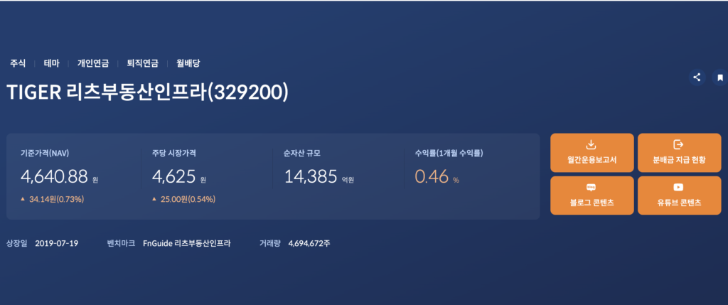 TIGER 리츠부동산인프라 ETF(329200) 상품 정보 바로가기 | 국내 최초 리츠·인프라 인컴형 ETF·구성종목·수익률·분배금·총보수
