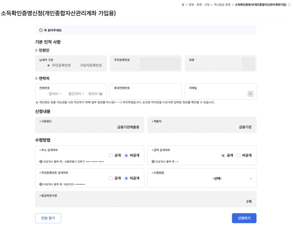 - 민원증명 → 소득확인증명서(개인종합자산관리계좌 가입용) 검색