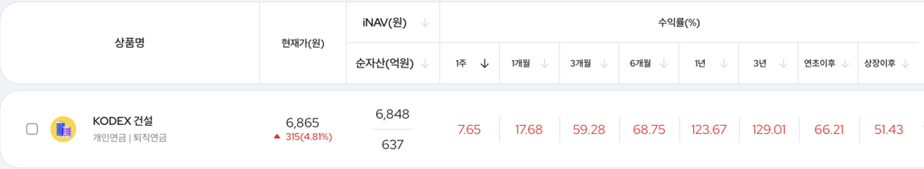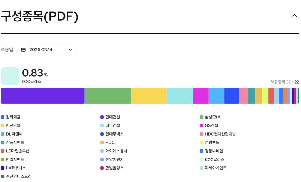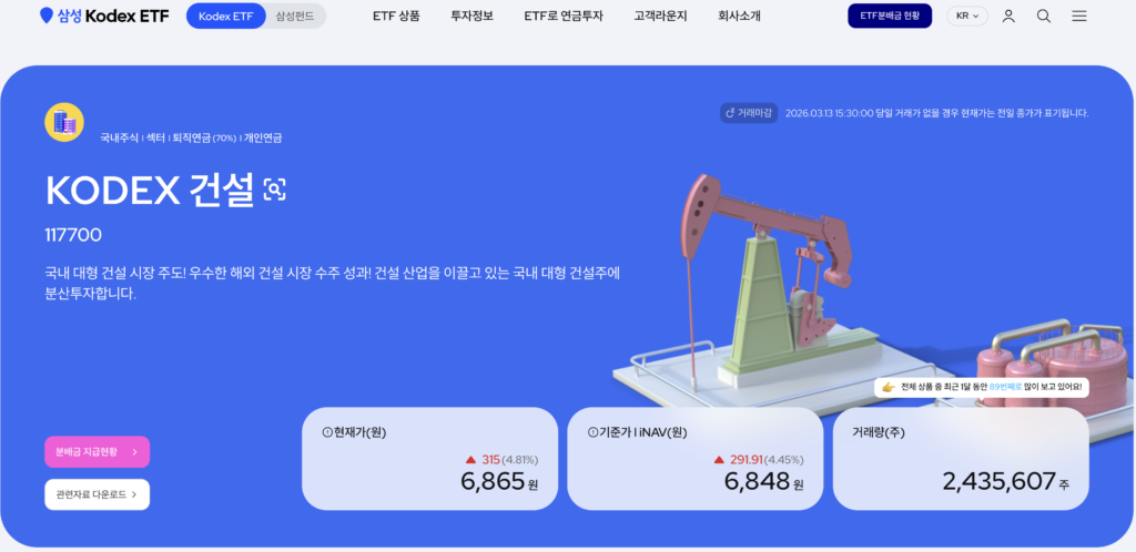 KODEX 건설 ETF(117700) 상품 정보 바로가기 | 국내 대형 건설주·우수 해외 건설 시장 수주 성과·수익률·구성종목·분배금·총보수 2026년 03월 14일 작성자: BOSTON ATLAS KODEX 건설 ETF (117700)은 KRX 건설 지수를 추종하는 ETF로, 국내 건설 산업 대표 기업에 분산 투자할 수 있는 상품입니다. 현대건설, 삼성E&A 등 주요 건설사를 중심으로 구성되어 국내 건설 경기와 해외 인프라·플랜트 수주 흐름을 반영하는 것이 특징입니다. 총보수는 연 0.45%로 운용·판매·신탁 보수가 포함되며, 건설 산업 전체에 간접 투자할 수 있는 섹터 ETF입니다. KODEX 건설 ETF(117700) 상품 정보 바로가기 페이스북 밴드 카카오톡 네이버 라인 X 링크 복사 [유리알코팅밤] 라네즈 립 글로이 밤 10g (6종) | 올리브영 대한민국 NO.1 헬스&뷰티 스토어 OLIVEYOUNG 라네즈 립 슬리핑 마스크 EX 20g 쇼트케이크 | 올리브영 대한민국 NO.1 헬스&뷰티 스토어 OLIVEYOUNG [한정기획] 라네즈 립 슬리핑 마스크 20g 7종(단품/기획) | 올리브영 대한민국 NO.1 헬스&뷰티 스토어 OLIVEYOUNG [단독기획/화잘먹] 조선미녀 맑은쌀 선크림 50ml 2입 기획 | 올리브영 대한민국 NO.1 헬스&뷰티 스토어 OLIVEYOUNG [피부톤업] 조선미녀 쌀겨수맑은세럼 30ml | 올리브영 대한민국 NO.1 헬스&뷰티 스토어 OLIVEYOUNG 조선미녀 붉은팥 PDRN 모공탄력 세럼 30ml | 올리브영 대한민국 NO.1 헬스&뷰티 스토어 OLIVEYOUNG 이 포스팅은 올리브영 쇼핑 큐레이터 활동의 일환으로, 구매 시 일정 금액의 수수료를 제공받습니다. 클릭 후 파트너스 활동을 통해 일정액의 수수료를 받습니다. 이 게시물이 얼마나 유용했습니까? 평점을 매겨주세요. 평점 제출하기 평균 평점 5 / 5. 투표 수 24 지금까지 투표한 사람이 없습니다. 가장 먼저 게시물을 평가해 보세요.