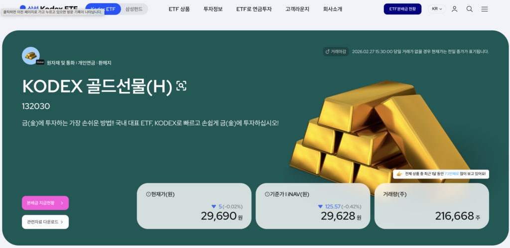 KODEX 골드선물(H) ETF(132030)는 COMEX 금 선물 가격을 추종하는 환헤지형(H) ETF로, 달러 환율 변동 영향을 최소화하며 국제 금 가격에 투자할 수 있는 상품입니다. 선물 ETF 특성상 만기 도래 시 기존 계약을 다음 계약으로 교체하는 롤오버 과정이 발생하며, 이로 인해 금 가격과 수익률에 차이가 생길 수 있습니다. 따라서 장기 보유보다는 인플레이션·금 가격 방향성이 뚜렷한 구간에서 전략적으로 접근하는 것이 중요합니다.