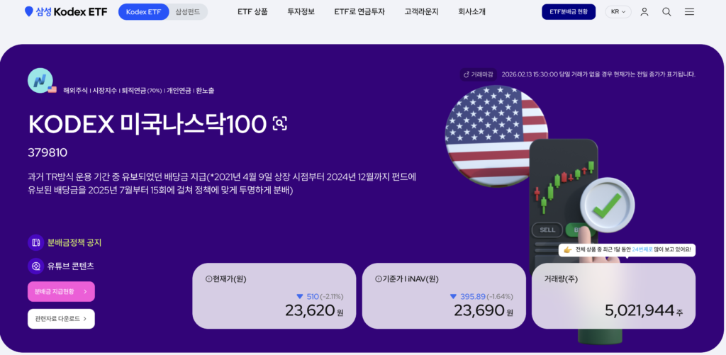 KODEX 미국나스닥100 ETF(379810)는 삼성자산운용이 운용하는 미국 대표 테크주 ETF로, 나스닥100 지수를 추종합니다. 금융주를 제외한 비금융 대형 기술주 중심으로 구성되어 있으며, 애플·엔비디아·마이크로소프트 등 글로벌 핵심 기업에 분산 투자하실 수 있습니다. 수익률, 분배금, 총보수까지 공식 홈페이지에서 투명하게 확인 가능해 장기 투자 기준으로 적합합니다.