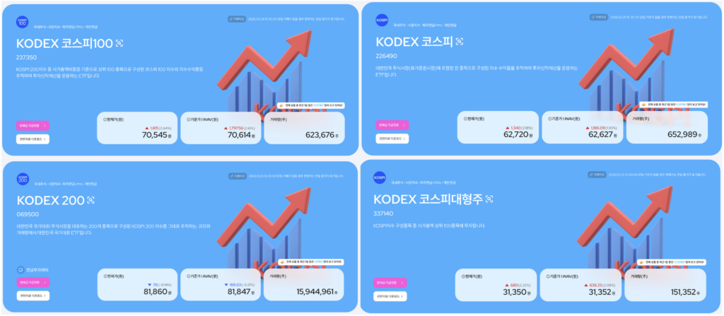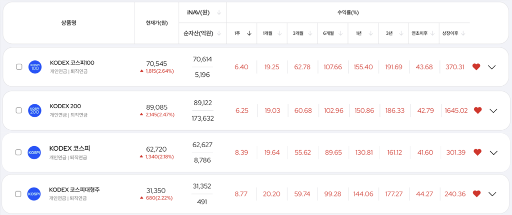 - KODEX 코스피: 코스피 전체 종목 추종, 분산은 넓지만 소형주 비중으로 수익률 체감 낮은 편