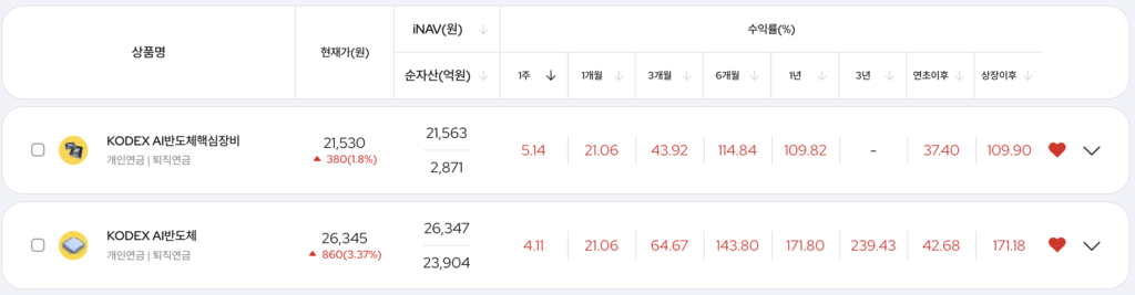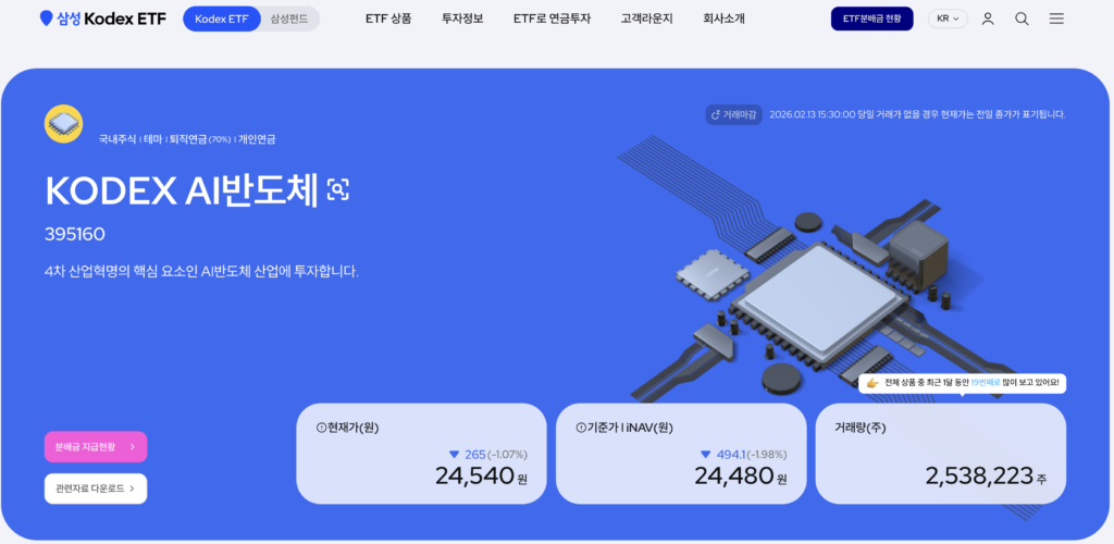 KODEX AI반도체 ETF(395160)는 AI 시대 핵심 산업인 반도체 분야에 집중 투자하는 국내 대표 테마 ETF입니다. 삼성전자, SK하이닉스 등 AI반도체 관련 주요 기업으로 구성되어 있으며, 지수 추종 방식으로 운용됩니다. 공식 홈페이지를 통해 구성종목, 기간별 수익률, 분배금 지급 내역, 총보수까지 투명하게 확인하실 수 있어 중장기 테마 투자 기준 설정에 적합합니다.