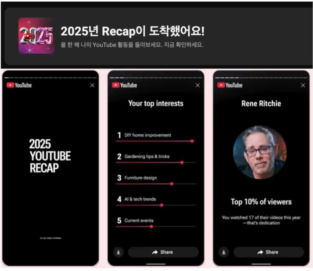 • 유튜브 리캡: 연간 또는 시즌별 시청/청취 기록을 요약해 보여주는 개인화된 기능