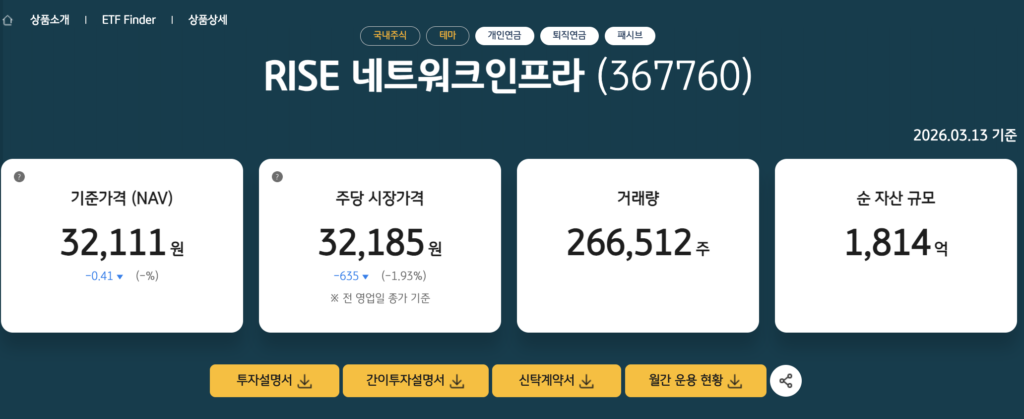 RISE 네트워크인프라 ETF(367760) 상품 정보 바로가기 | 5G 핵심 인프라집중 투자 ETF·구성종목·수익률·분배금·총보수