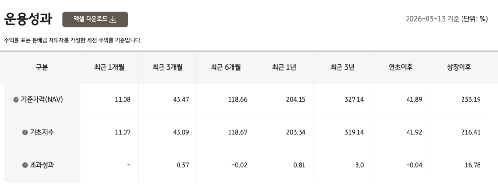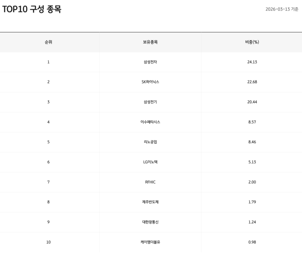 • 시가총액 방식에 종목당 최대 20% 비중 제한을 적용해 쏠림 위험을 낮췄고, 삼성전자·SK하이닉스 등 대형 기술주가 주요 구성종목입니다.