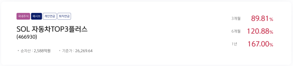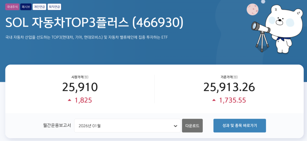 국내 자동차 산업에 효율적으로 투자하고 싶으신 분들께 SOL 자동차TOP3플러스 ETF(466930)는 주목할 만한 상품입니다. 이 ETF는 국내 자동차 산업을 선도하는 TOP3(기아, 현대차, 현대모비스)를 중심으로 자동차 밸류체인 전반에 분산 투자합니다. 시가총액 상위 종목 비중이 높아 산업 대표성도 우수합니다.