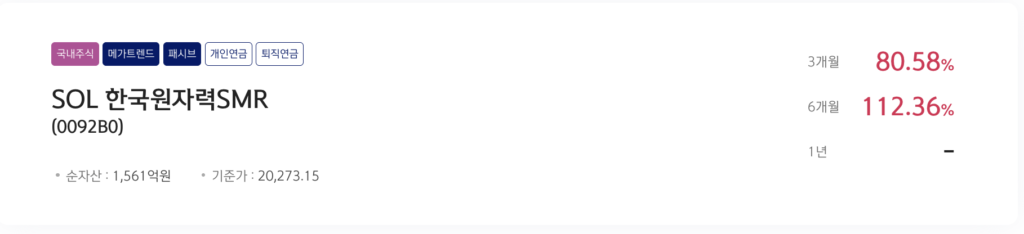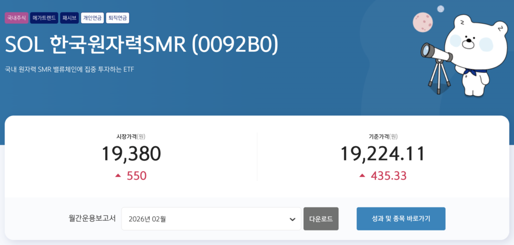 SOL 한국원자력SMR ETF(0092B0) 상품 정보 바로가기 | 국내 원전·SMR 밸류체인 투자·구성종목·수익률·분배금·총보수 2026년 03월 14일 작성자: BOSTON ATLAS SOL 한국원자력SMR ETF(0092B0)은 국내 원자력 및 소형모듈원자로(SMR) 관련 기업에 집중 투자하는 테마형 ETF입니다. 원전 기자재, 설계, 운영 등 밸류체인 전반을 포괄하며 FnGuide 한국원자력SMR 지수를 추종합니다. 총보수는 연 0.45%이며 분배금은 연 1회 지급되는 구조입니다. SOL 한국원자력SMR ETF(0092B0) 상품 정보 바로가기 페이스북 밴드 카카오톡 네이버 라인 X 링크 복사 [유리알코팅밤] 라네즈 립 글로이 밤 10g (6종) | 올리브영 대한민국 NO.1 헬스&뷰티 스토어 OLIVEYOUNG 라네즈 립 슬리핑 마스크 EX 20g 쇼트케이크 | 올리브영 대한민국 NO.1 헬스&뷰티 스토어 OLIVEYOUNG [한정기획] 라네즈 립 슬리핑 마스크 20g 7종(단품/기획) | 올리브영 대한민국 NO.1 헬스&뷰티 스토어 OLIVEYOUNG [단독기획/화잘먹] 조선미녀 맑은쌀 선크림 50ml 2입 기획 | 올리브영 대한민국 NO.1 헬스&뷰티 스토어 OLIVEYOUNG [피부톤업] 조선미녀 쌀겨수맑은세럼 30ml | 올리브영 대한민국 NO.1 헬스&뷰티 스토어 OLIVEYOUNG 조선미녀 붉은팥 PDRN 모공탄력 세럼 30ml | 올리브영 대한민국 NO.1 헬스&뷰티 스토어 OLIVEYOUNG 이 포스팅은 올리브영 쇼핑 큐레이터 활동의 일환으로, 구매 시 일정 금액의 수수료를 제공받습니다. 클릭 후 파트너스 활동을 통해 일정액의 수수료를 받습니다. 이 게시물이 얼마나 유용했습니까? 평점을 매겨주세요. 평점 제출하기 평균 평점 5 / 5. 투표 수 45 지금까지 투표한 사람이 없습니다. 가장 먼저 게시물을 평가해 보세요.