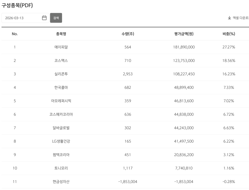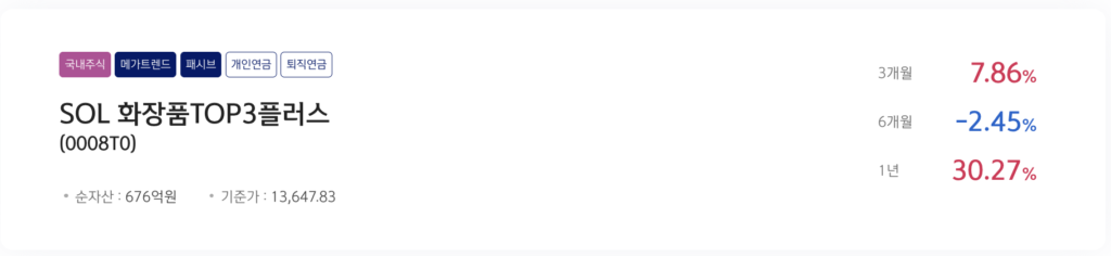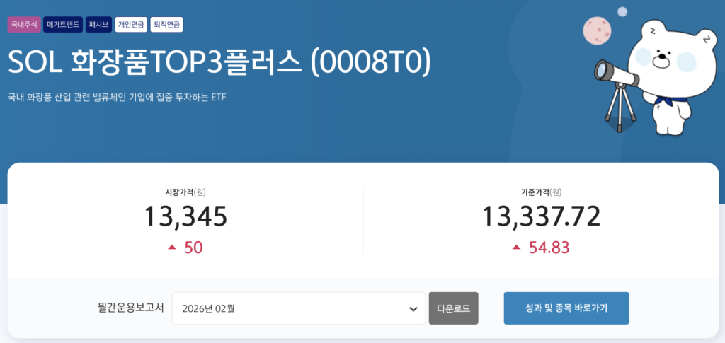 SOL 화장품TOP3플러스 ETF(0008T0) 상품 정보 바로가기 | K-뷰티 대표주 투자·구성종목·수익률·분배금·총보수