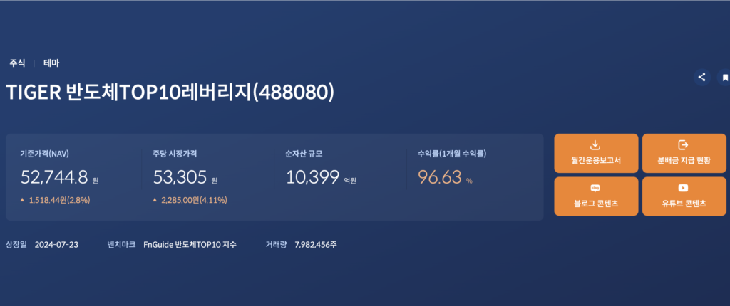 TIGER 반도체TOP10레버리지 ETF(488080)는 삼성전자, SK하이닉스 등 국내 반도체 핵심 10종목으로 구성된 지수의 일별 수익률을 2배로 추적하는 레버리지 ETF입니다. 단기 반도체 업황 반등 시 높은 수익을 기대할 수 있으나, 하락장에서는 손실이 빠르게 확대되고 장기 보유 시 복리 효과로 인해 지수와 괴리가 발생할 수 있어 투자 시 각별한 주의가 필요합니다.