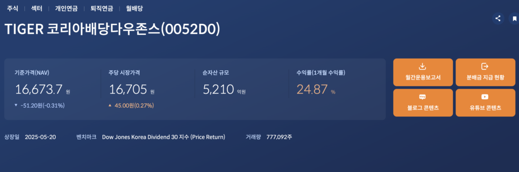 TIGER 코리아배당다우존스 ETF(0052D0) 상품 정보 바로가기 | 수익률·월배당 지급일·구성종목