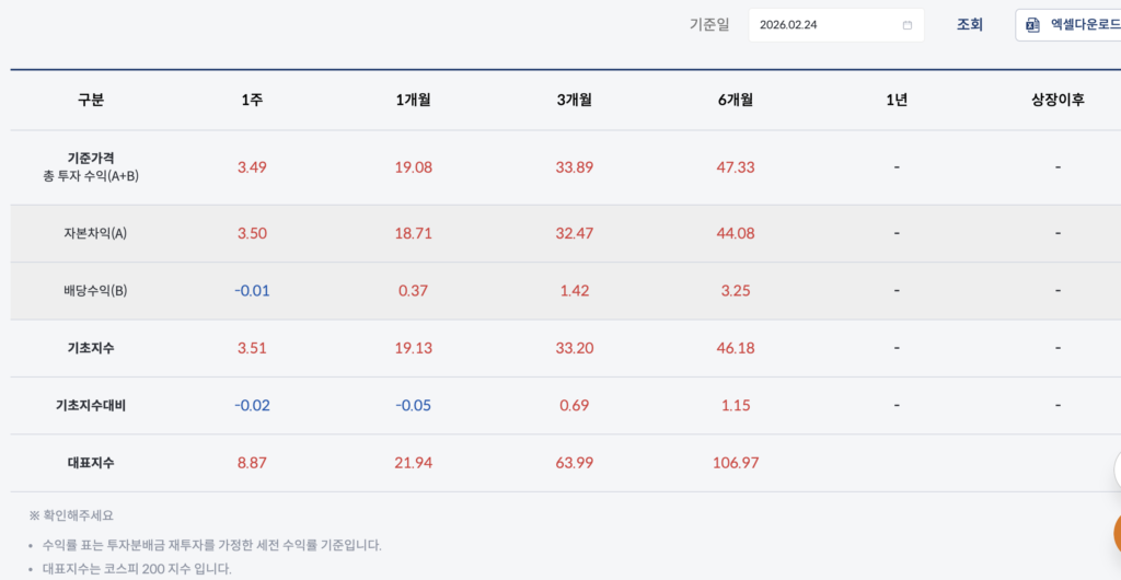 국내 월배당 ETF이며 미국 SCHD 전략을 국내 주식에 적용한 TIGER 코리아배당다우존스 ETF(0052D0)는 Dow Jones Korea Dividend 30 지수를 추종하며, 2026년 2월 기준 1개월 수익률 24.87%를 기록하였고, 매월 15일을 기준으로 월배당을 지급합니다. 현대차, 금융지주 등 배당 안정성이 높은 국내 우량주로 구성된 것이 특징입니다.
