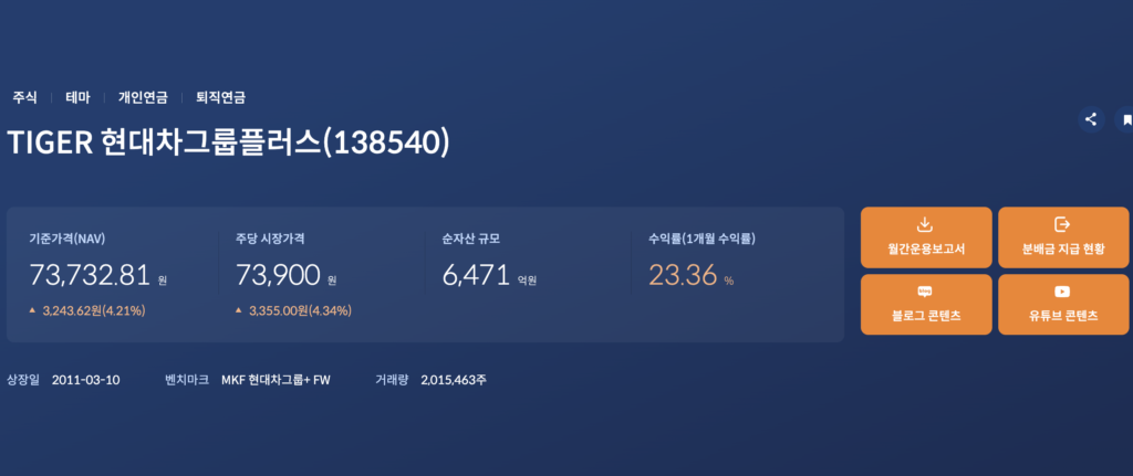 TIGER 현대차그룹플러스 ETF(138540)는 현대차, 기아, 현대모비스 등 현대차그룹 핵심 계열사에 분산투자하는 국내 주식형 ETF입니다. 그룹 전반의 성장 흐름을 한 번에 추종할 수 있다는 장점이 있지만, 특정 그룹에 집중된 구조로 인해 업황 둔화 시 변동성이 확대될 수 있습니다. 개별 종목 리스크를 줄이면서도 그룹 단위 투자를 고려하는 투자자분들께 참고가 되는 상품입니다.
